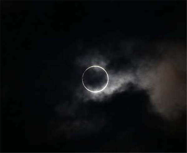 15时55分,人群中传来欢呼声,太阳冲破迷雾,食甚短暂出现。这次太阳被“食”得更加厉害,“亮圆盘”99%的面积被遮住,露出“润泽细长”的金边,形成了“百年不遇”、难得一见的“超大食分”的日环食,虽然转瞬即逝,但是能一睹罕见的“金边日食”,已经让现场观众大呼过瘾,觉得不虚此行。
