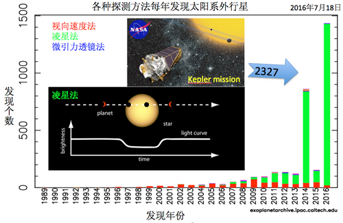 图1: 不同观测方法每年发现系外行星的个数。凌星法就是通过捕捉行星在视线方向上穿越恒星表面引起的恒星可视光度变化来探测系外行星。凌星法的杰出代表是Kepler卫星计划。Kepler目前发现了2327颗系外行星,约占所有已知系外行星总数的三分之二。