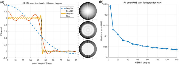 图3(a) 用4阶、20阶和140阶球冠函数拟合半球上的台阶分布,获得很高的拟合精度