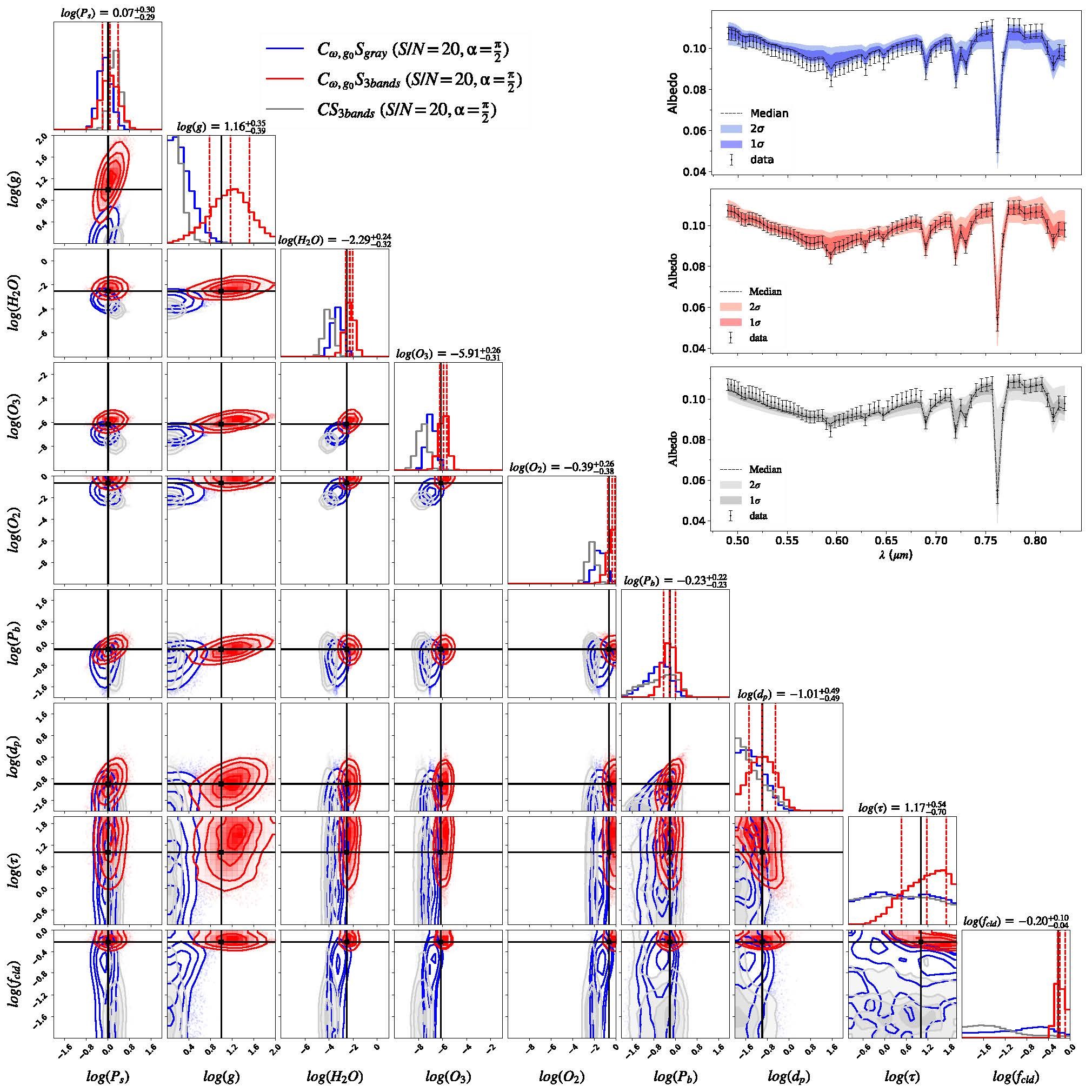 得益于海洋、裸地及绿地在波长相关的反照率方面的差异,模型除了能反演上面给出的14个参数,还可以对行星地表类型给出一定限制。