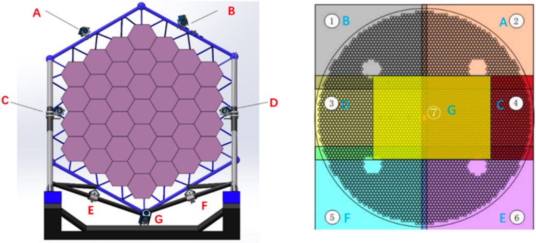 光纤检测相机在主镜MB周围的安装位置(左)及对应相机在焦面上覆盖的区域分布(右)