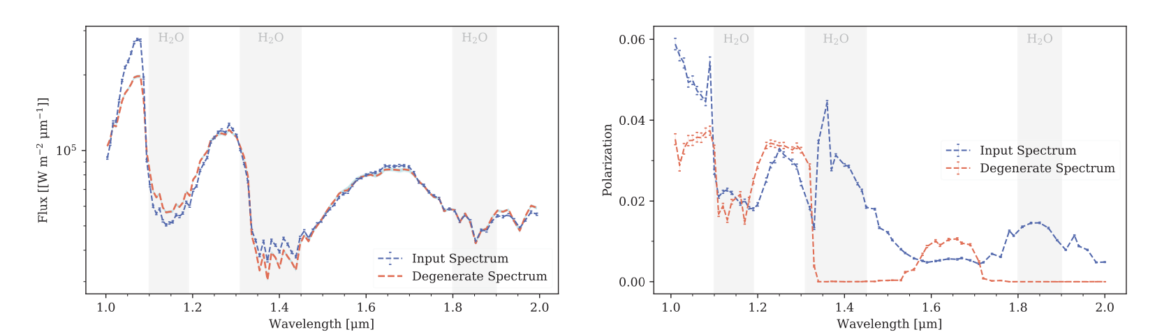 图2 偏振光谱揭示棕矮星大气性质。左:在不同化学丰度、温度分布的情况下可产生相似的通量光谱。右:对应的偏振光谱在分子吸收带内表现出显著差异,显示偏振观测可有效打破传统光谱分析中的模型简并情况。