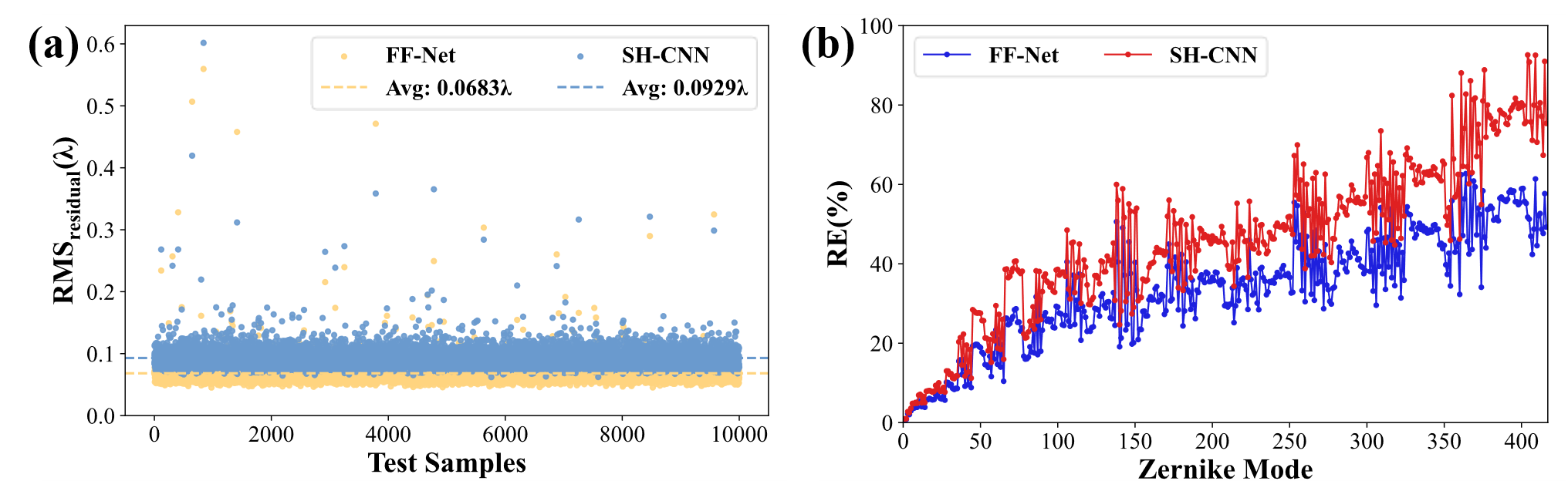 图3 FF-Net与SH-CNN在测试集上的超分辨率波前重构能力对比。(a) 残差波前的均方根值散点图;(b) 单阶模式重构的相对误差值折线图。