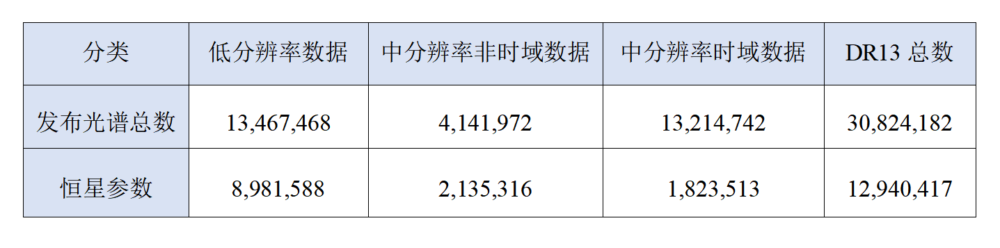 DR13数据集的观测周期为2011年10月-2025年6月,覆盖6961个低分辨率观测天区,3404个中分辨率观测天区。发布的3082万条光谱包括约1347万条低分辨率光谱,1735万条中分辨率光谱。此外,DR13发布数据中还包括一个约1294万组的恒星光谱参数星表。LAMOST发布的光谱总数与恒星参数星表规模继续保持世界领先。发布数据的具体信息如下: