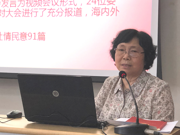 崔向群院士从会议概况、大会有关报告和决定、热点问题等方面全面系统地对2020年全国“两会”精神作了传达。她介绍了今年全国两会的召开背景、会议议程、提案议案和李克强总理参加她所在的科技界委员讨论会等基本情况,重点传达了习近平总书记两会期间发表的系列重要讲话精神和李克强总理做的政府工作报告的主要内容,传达了审议大会工作报告、计划报告和预算报告、《中华人民共和国民法典(草案)》、最高人民法院和最高人民检察院工作报告、《关于建立健全香港特别行政区维护国家安全的法律制度和执行机制的决定》等情况。