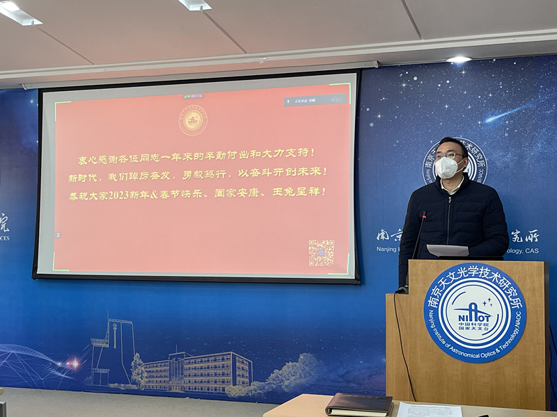 宫雪非向大会通报了2022年研究所财务收支情况、资产、科研项目和人力资源等总体概况。他指出,南京天光所围绕主责主业,优化科研布局,2022年建立以“四室一中心”为主体的科研组织架构,增强了研究所聚集主责主业的竞争力和科技创新活力。宫雪非强调,研究所重点开展定向性基础研究,积极推进中国大型光学红外望远镜的建设,“十四五”重大科研任务“大型天文光学红外望远镜前沿技术研究”获得“大科学装置前沿研究”重点专项科技部立项。研究所作为10月9日成功发射的先进天基太阳天文台(ASO-S)“夸父一号”卫星的有效载荷全日面矢量磁像仪(FMG)主任设计师单位,参与研制的FMG是我国第一台空间太阳磁场测量设备,成功实现了我国首次在空间开展太阳磁场观测,已获得的太阳局部纵向磁图的质量达到国际先进水平,为聚焦“一磁两暴”科学目标,实现高时间分辨、高精度的太阳磁场观测奠定了良好的基础。全年有力推进中国空间站巡天空间望远镜系外行星成像星冕仪、无缝光谱仪组件初样研制按计划紧锣密鼓地实施。LAMOST光谱巡天获得2000万条光谱,主动光学关键执行器件自主研制获重大突破并已开展实际观测应用。国家自然科学基金重大科研仪器项目“围绕暗弱恒星的太阳系外行星高对比度成像探测仪器研制”、“30m望远镜拼接式非球面主镜的子镜面形检测设备”、“基于差分延迟干涉的微角秒天体测量装置研制”进展顺利。国际合作重大科研仪器项目“西班牙GTC高分辨率超稳定光谱仪”正式启动。1.6米多通道测光巡天望远镜完成现场装调并顺利出光,在国际上首次实现较大通光口径大视场、多通道高精度测光巡天。同时,在国家基金、省基金、重大研制项目争取方面稳中有进,在天文光学新技术研究、系列大中型天文望远镜研制、系列光谱仪等科学仪器研制、镜面研制与镀膜等科研项目方面均取得可喜的重要进展。报告还总结了人才队伍建设、制度建设、新园区和科研平台建设、质量、保密、科学传播、信息化、统战、工会和团委等方面工作取得的新成绩。宫雪非最后对2023年全所工作重点进行了部署,他指出,2023年是全面贯彻落实党的二十大精神的开局之年,全所要集中精力于创新发展,把研究所重点工作和大事、要事完成好,踔厉奋发,勇毅笃行,以团结奋斗开创美好未来。