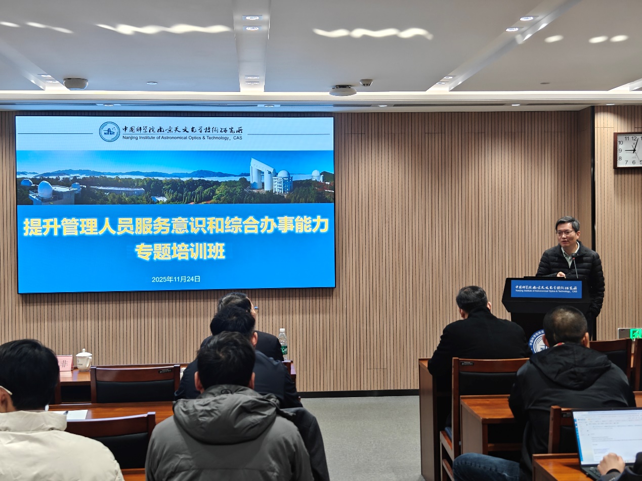 为强化管理支撑、服务科研攻关,中国科学院南京天文光学技术研究所于2025年11月24日举办了“提升管理人员服务意识和综合办事能力”专题培训班。来自管理部门和各科研部门的30余名人员参加了此次培训。会议由纪委书记任树林主持。